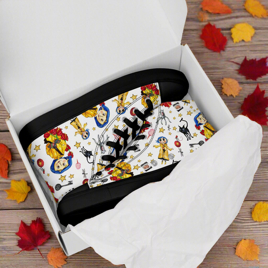 Walk in Coraline's shoes with our Twitchy Witchy Girl High Top Canvas Sneakers, featuring a vibrant, eye-catching design with button-inspired accents and whimsy that nods to the film and book.