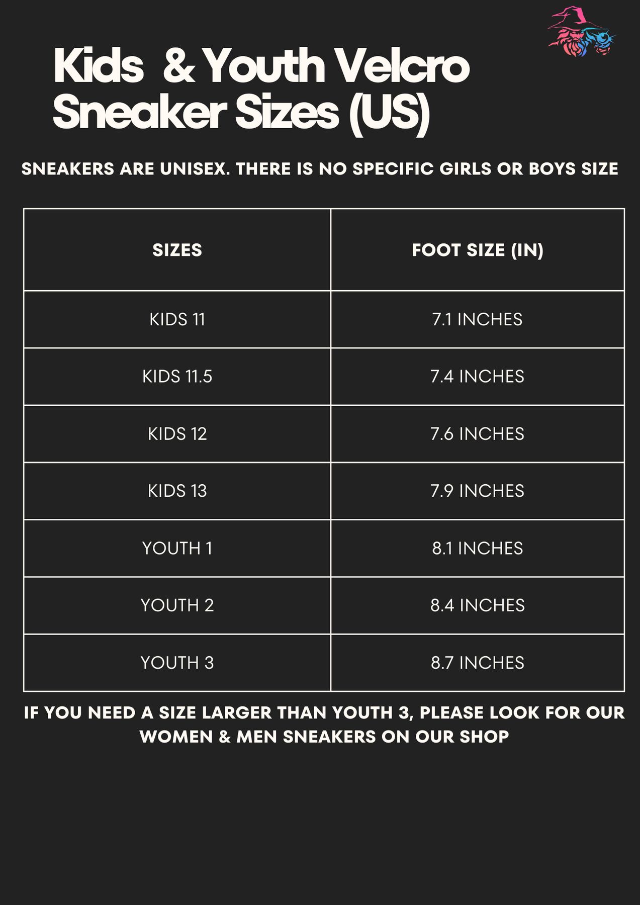 *Velcro Sneakers tend to run smaller, we suggest a size up to ensure proper fit. Or purchase the High Tops which tend to provide more room*